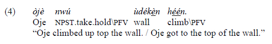 In most resultative SVCs, it is the nominal following V1 that is maximally repositioned. When the displaced nominal is a locative noun and V2 accepts it as direct object, e.g. heen ùdékèn 'climb wall,' it is SVC subject that undergoes maximum displacement.