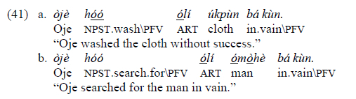 Our assessment of secondary concepts does not pretend to be exhaustive or comprehensive. It has simply emerged from our attempt to characterize Emai verbs in serial verb constructions. Clearly, however, there is much more about serial verbs in Emai and West Africa to be gained by scrutinizing their possible associations with secondary concepts in a systematic fashion.