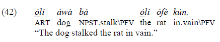 The complex form ba kun and its arguments appear in an A-SVC. It expresses meanings related to hunting or stalking an animate entity without success. The major component of this A-SVC is form ba 'stalk, pursue,' which otherwise appears as a verb that is monotransitive (bá íni 'stalk elephant') or intransitive (ba 'stalk'). Its corresponding minor component is form kun. In a simple clause, kun is no longer synchronically active as a main verb, although it may be related to forms in neighboring languages such as Bini ku 'depreciate in value' (Melzian 1937) or Yoruba kùnà 'fail/miss/come short of (Church Missionary Society 1950). Regardless of the exact meaning of kun, SVCs with ba kun seem less resultative-like than does fee ghoo. Rather, kun appears to specify the extent, more precisely the lack thereof, of the motion event denoted by ba.