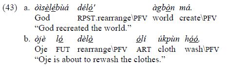 A third form related to the TRYING class is delo.. In an A-SVC it refers to a secondary concept that denotes a redoing of a previous action. In an SVC, minor component delo 'rearrange' in the V1 slot precedes its major component in the V2 slot. Forms occurring as V2 such as ma 'create, mold' or hoo 'wash' refer to a change of state. The nominal undergoing change also precedes rather than follows V2. A-SVCs with delo show the syntax of a maximum extent resultative since the nominal that undergoes change always appears in simple clauses as direct object of V2 but not necessarily of V1. Each major verb takes as its direct object in a simple clause the direct object of the resultative SVC, as in ma àgbàn 'create world' and hoo ukpùn 'wash cloth.' Major verbs in resultatives tend not to express an irrecoverable change of state.