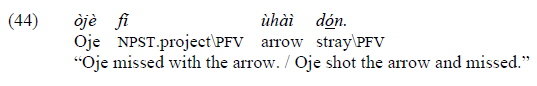 A fourth element of the TRYING class is verb don. It serves as minor component in the V2 slot of an A-SVC. With respect to a desired end state, don conveys non-achievement. It expresses meanings related to straying or stretching from an unspecified target referent. Its near equivalent in English is 'miss.' In an A-SVC V2 don appears with major components like fi 'project, throw, shoot.' In SVCs the direct object of V1 and the logical subject of V2 exhibit a switch function relation. In (20), the nominal ùhài as grammatical object of V1 is also the logical subject of V2. SVCs with don seem less resultative-like and more cause-effect-like in their meaning.