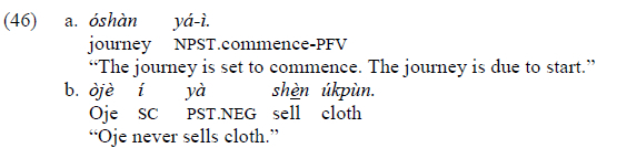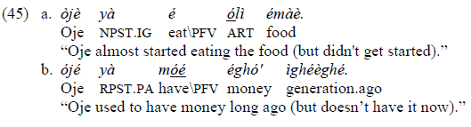 Emai is a minor language in the Edoid group (Elugbe 1989). It is spoken in over 10 villages with approximately 20-25,000 speakers. A tonal language, Emai shows lexical and grammatical tones high ('), low Q, and downstep high (''). Its morphological template for the basic verb is X-stem-Y. X identifies a persistive qualifier prefix and Y encompasses contrasting perfective/ imperfective toneme suffixes. Tones from these suffixes spread onto lexically toneless verbs. The imperfective suffix is a floating low tone. Traces of perfective suffix and its high tone are evident in simple clauses with an intransitive verb or a monotransitive verb whose direct object has left dislocated. Generalizing beyond this template to the syntactic predicate, a similar templatic arrangement emerges with X-predicate-Y, where X refers to pre-predicate classes of auxiliaries and preverbs and Y to a post-predicate class of particles, which can then be followed by adverbs or prepositional phrases. Predicates in Emai can be simple intransitive, transitive, or ditransitive verbs as well as complex verb plus particle constructions or serial verb constructions (SVCs).