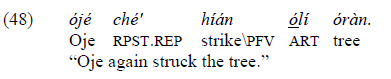 Several synchronic preverbs that associate with the PHASAL class also occur as a verb form. Form ya has two preverb functions: ingressive/proximative and past absolute. Respectively, these meanings align with event onset relative to the deictic present ('almost began/started') or event occurrence in the past as it relates to the present 'used to but does not now.' Although the segmental and tonal form of ya is constant, the respective meanings just mentioned co-vary with the tonal character of the grammatical subject: Near past low tone with 'almost began' and remote past high tone with 'used to.'