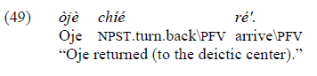 A related verb is chie/che (ôjè chíé-l [Oje turn.back-PFV] 'Oje has turned back'). It denotes a turn around action and by implication a retracing of one's initial path. The latter inference is explicitly coded by minor component re in an A-SVC.