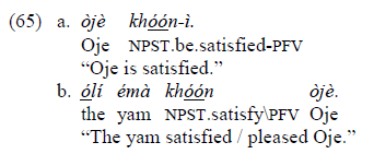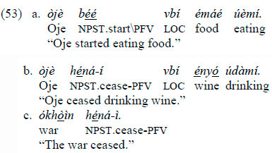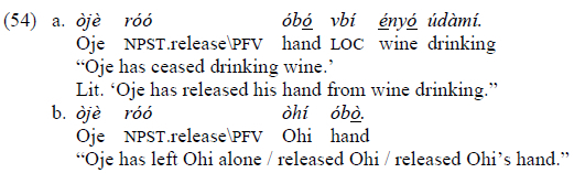 One Emai verb associated with the PHASAL class exhibits a more complex syntax. Verb roo requires a direct object that contains body-part nominal óbo 'hand,' either alone or in an external possessor phrase where possessor precedes possessum óbo.
