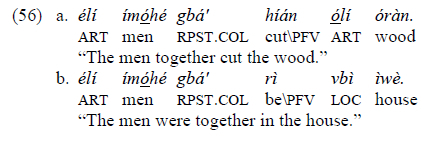 Preverb gbà has a collective 'together' function. It codes a quantificational value ascribed to its grammatical subject, which must be plural. It co-occurs with transitive or intransitive verbs (56).