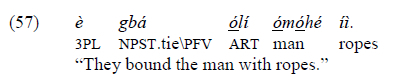 In simple clauses, the form gba occurs as a verb. It appears as either monotransitive with a single object (gba ólí ómohè 'tie the man') or ditransitive with a double object (57). Regardless of transitivity value, gba has sense 'tie, bind.'
