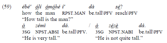 Verb-noun collocational phrases from which the preverbs above derive historically include: dábo 'deliberately' from daa ábo 'prop hands;' dóbo 'mistakenly' from dee óbo 'lower hand;' miti 'able' from moe étln 'have breath / spirit;' and dúdafrom de ùdà 'reach defiance.' Most of these collocations exist synchronically as a non-literal, figurative expression.