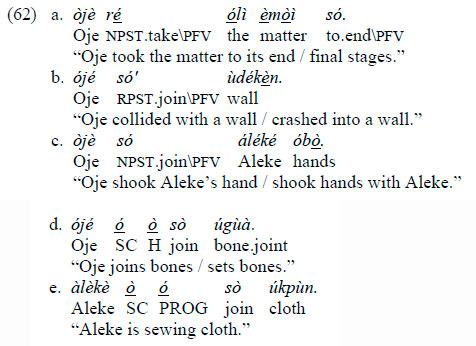 In non-SVCs each form in the V2 slot above occurs as sole verb of a clause. As transitive in a simple clause, verb so expresses meanings related to contact and joining. These meanings include getting to the end of a matter, setting bones, shaking hands, sewing cloth, and colliding with a wall. Each separate meaning arises from a specific collocation of verb and direct object.