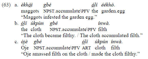 A symmetrical serial verb construction consists of two or more component verbs, each of which derives from a large open and unrestricted class. One subtype in Emai is cause-effect. Exemplars convey a change of material state expressed by the verb in the V2 slot. The construction argument that undergoes change appears as direct object of V1 and as logical subject of V2, a relation of switch function. Verbs that appear as V1 include transitive hoo úkpun 'wash a cloth.' As V2, we find intransitives such asfuan 'become clean.'