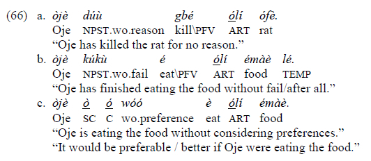 Although there is evidence that many preverbs have a lexical or phrasal heritage related to verb status, not all preverbs do. This is particularly true of Emai preverbs that fit the SEC-A-1 NEGATOR class (where wo in [66] signifies "without"). Relative to a given action, each conveys speaker judgment about event activation: without reason, without failure to meet an end state, or without due consideration of a preferred course of action.