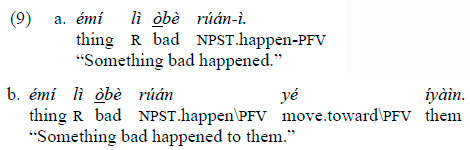 The HAPPEN verb ruan is limited to intransitive structures. In addition to simple clauses (9a), ruan appears as major component in the V1 slot of an A-SVC (9b). In the V2 slot is minor verb ye 'move toward' in its allative function.