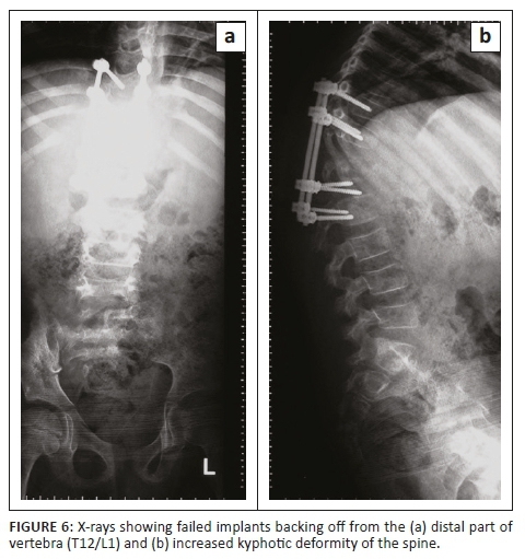 X-rays showed failed implants; therefore, the pedicular screws were backed off from the distal part of the vertebra (T12/L1) with increased kyphotic deformity of the spine (Figure 6).