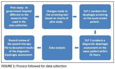 METHODOLOGY: To establish the validity and reliability of the South African dysphagia screening tool (SADS) for acute stroke patients accessing government hospital services. The study was a quantitative, non-experimental, correlational cross-sectional design with a retrospective component. Convenient sampling was used to recruit 18 speech-language therapists and 63 acute stroke patients from three South African government hospitals. The SADS consists of 20 test items and was administered by speech-language therapists. Screening was followed by a diagnostic dysphagia assessment. The administrator of the tool was not involved in completing the diagnostic assessment, to eliminate bias and prevent contamination of results from screener to diagnostic assessment. Sensitivity, validity and efficacy of the screening tool were evaluated against the results of the diagnostic dysphagia assessment. Cohen's kappa measures determined inter-rater agreement between the results of the SADS and the diagnostic assessment.