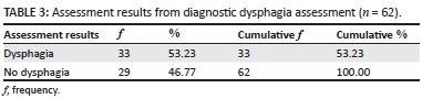 Results of the diagnostic assessment indicated that 52.23% (n = 33) of the participants presented with dysphagia and 46.77% (n = 29) of the participants did not present with dysphagia.