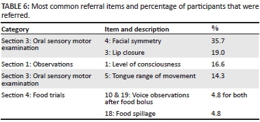 There were particular items that were more sensitive in detecting signs and symptoms of dysphagia than others. The items in Table 6 were the most common referral items in the SADS in order of frequency.