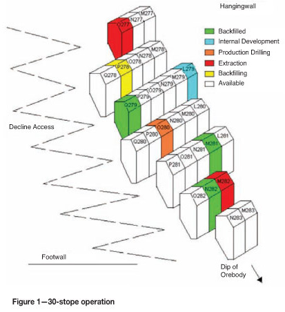 Stope production is represented by four phases, commencing with internal development followed by production drilling and ore extraction before backfilling takes place. As shown in Figure 1, the operation comprises a total of 30 stopes, three of which have already completed the entire production process to become a fully consolidated fillmass, one undergoing internal development, one in the production drilling phase, two in the ore extraction phase, and one undergoing backfilling, leaving the remaining 22 stopes available for the commencement of production with the internal development phase, subject to the completion of all necessary preceding external development activities.