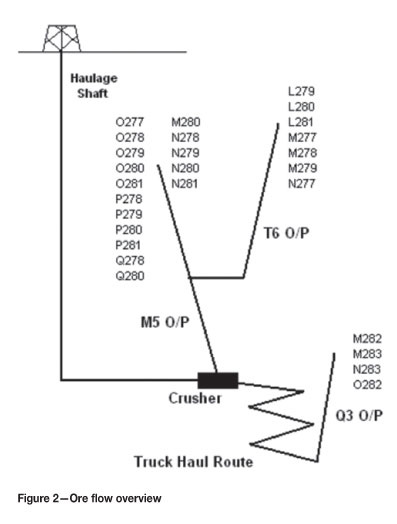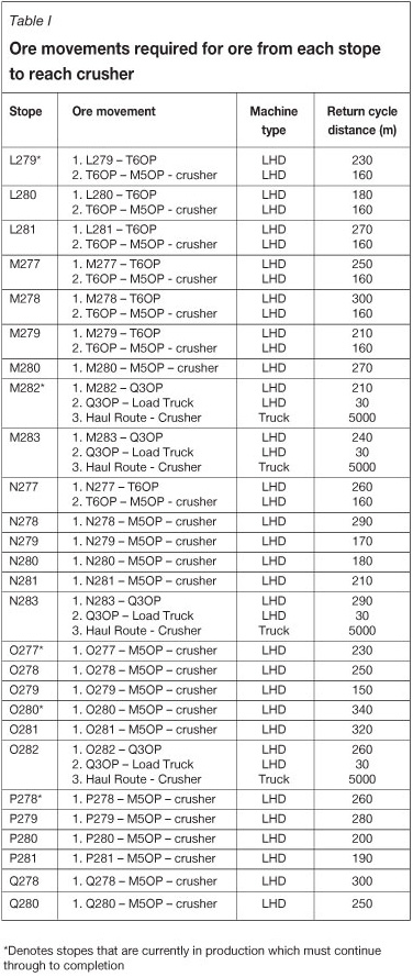 As shown in Figure 2, ore from the majority of stopes is tipped into the M5 orepass, which feeds directly to the crusher. Ore from the T6 orepass, which also services a number of stopes in the upper part of the orebody, requires rehandling before also being tipped into the M5 orepass at an LHD transfer level. Depth extensions to the orebody have resulted in mine expansion activities below the current crushing horizon. As a result, ore from stopes M282, M283, N283, and O283 is tipped into the Q3 orepass, which channels ore to a central truck loading facility from where it is hauled up the haul route to the crusher. Table I presents the complete route (including primary and secondary ore movements) that ore from each stope must take in order to reach the crusher, and the respective return-trip LHD and truck cycle distances associated with each primary and secondary ore movement.