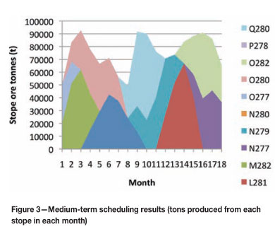In scheduling production from this operation all adjacency interactions for all stopes as well as existing and future fillmasses are enforced. During each month of production the operation's ore handling system, including the main haulage shaft, is restricted to 95 000 t at a combined blend of no less than 1.8 percent Cu and no greater than 2.6 percent Cu. The operation's medium-term schedule spans one and a half years at monthly intervals for a total of 18 months, whereby the objective is to maximize NPV at a discount rate of 10 percent per annum. In addition, the first twelve months, production will undergo short-term scheduling, with each month being divided into four equal intervals for a total of 48 short-term intervals over which the objective is to minimize deviation from a targeted mill feed grade of 2.20 percent Cu for an upper ore limit of 25 000 t.