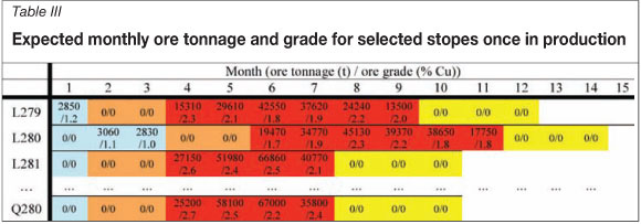 The numbering system in this case defines which external development item need to be completed for each respective stope in descending order (the highest first, followed by the second highest, etc). To ensure continuity and a smooth transition from the current scheduling regime to the new one, all stopes and external development items that are currently active will be seen through to completion. Coloured numbers represent different activity streams that do not have any sequencing inactions with other streams for the respective stope. Also presented in Table II are the expected completion times (months) once commencement has been initiated for each stope and external development activity. To form the basis for medium-term scheduling, an ore tonnage (t) and grade (percent Cu) distribution can be generated for each stope over each monthly period once commencement is initiated. The results are shown in Table III for a selected number of stopes.