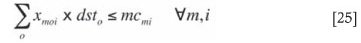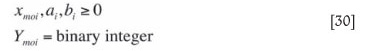 Constraint [22] ensures that metal tons for the respective target mill feed grade produced across all machines from primary ore movements in each short-term interval balances with the metal tonnage excess ai or shortfall bi deviation for the respective ore tonnage being processed. Constraint [23] ensures that ore production from each primary ore movement does not exceed its reserve. Primary ore movement ore production in any short-term interval cannot exceed the haulage shaft capacity as enforced by constraint [24]. Constraint [25] ensures that the ore tonnage moved by each production machine in each short-term interval cannot exceed the individual capacities of the machines. Constraint [26] ensures that throughput across each secondary ore movement balances with ore from inflow primary ore movements in each interval. Constraint [27] ensures that a minimum tonnage must be moved (in this case 10 t) for it to be feasible for a machine to be assigned to an ore movement. This constraint also ensures that if xmoi = 0 -^Ymoi- = 0. Constraint [28] ensures that if xmoi is utilized, Ymoi must equal 1. Constraint [29] ensures that LHDs are not assigned to truck routes and trucks are not assigned to LHD routes. Finally, constraints [30] enforce non-negativity and integer values of the appropriate variables.