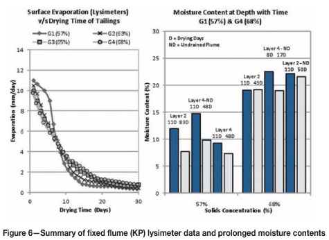 The results from the lysimeters show that, as the tailings solids concentration increases, the evaporative losses from the tailings surface are initially lower and prolonged as water release is slower in comparison to lower concentrations. This is evident from the changes observed in pore pressures presented previously and the results of the in situ density tests. Figure 6a presents the averages of the lysimeter data collected for all concentrations.