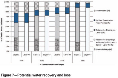 The liberation of water within a tailings facility is an important consideration when determining the potential recovery for high-density thickened tailings deposition. The results of the fixed flumes and laboratory testing indicate that the probability of recovering water from tailings deposited at 68% solids is likely to be very low to zero, whereas for 63-65% solids, some water recovery from the tailings facility could be expected. Table VI presents an estimate of overall potential recovery volumes that could be expected based on the observations and data collected from the pilot plant and the Talabre deposit.