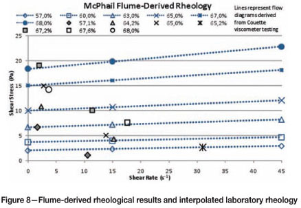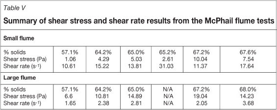 Shear stress and shear rate data developed from stream power-entropy based analyses of the Gordon McPhail fixed flume tests and the interpolated rheology are presented in Table V and plotted in Figure 8, together with flow diagrams derived from Couette viscometer testing.