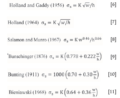 There are several representative coal pillar strength formulae from which the currently used hard-rock pillar strength formulae were deduced. These are: