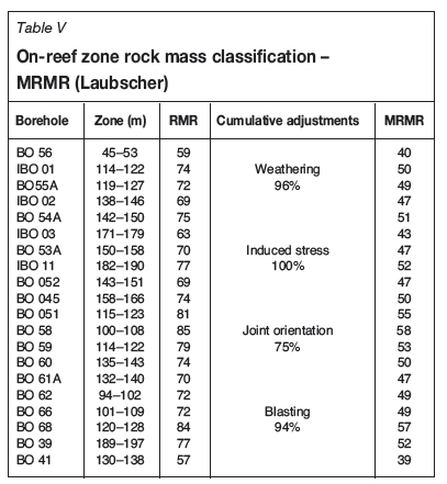 It was noted that results obtained using Equation [20] deviated from the Bieniawski RMR, so Equation [21] was used as it gave a closer correlation. Table IX gives the RMR values calculated from Q using Equation [21]. Table V gives the MRMR classification system results for the project.