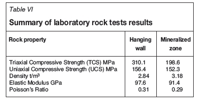 For a realistic pillar design criterion, rock mass properties were determined using laboratory uniaxial and triaxial compression tests. The parameters determined were UCS, Poisson's ratio, Young's modulus, and specific gravity. A summary of the tests results is shown in Table VI.