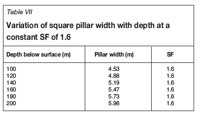 The resultant square pillar widths at various depths for a constant SF of 1.6 are given in Table VII.