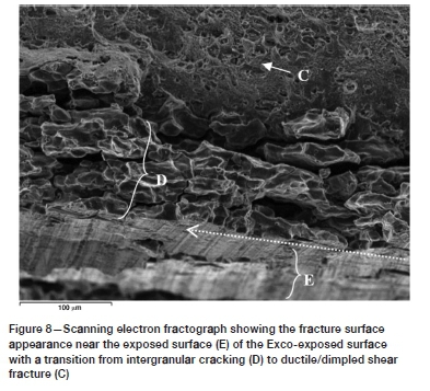 Optical microscopy of the EXCO-exposed surfaces prior to the KR loading revealed no evidence of substantial pitting and/or intergranular corrosion. Also, secondary intergranular cracking was not observed in the sodium chloride-exposed specimens, with a ductile (dimple-facet) type fracture surface directly adjacent to the exposed surface (refer to Figure 10). Additionally, microscopy of the sodium chloride-exposed alloy prior to KR loading revealed localized attack in the form of isolated pitting and intergranular corrosion on the exposed surfaces. It is thought that the variation in the localization of corrosive attack between the two exposure environments is a result of the difference in pH - that is, the significantly lower pH of the EXCO solution results in the rapid breakdown of the protective surface oxide layer, whereas only a localized breakdown of the oxide layer occurs at the more neutral pH of the sodium chloride solution. Consequently, uniform surface reactions may ensue in the case of the EXCO solution, while only localized (pitting) reactions are possible for the sodium chloride solution. Furthermore, it is probable that the low pH of the EXCO solution provides an abundance of hydrogen at the exposed surface, which may be absorbed via the grain boundaries of the alloy, thus embrittling the grain boundaries though one of the hydrogen embrittlement mechanisms mentioned in the Introduction. Further research is required to clarify if the intergranular fracture surface near the EXCO-exposed surface is in fact due to hydrogen embrittlement and, if so, which of the hydrogen embrittlement mechanisms induced the embrittlement; i.e. the HEDE, HELP, AIDE, or hydride formation mechanism. Other possible causes could be micro-corrosion at the grain boundaries or galvanic-type corrosion at the interfaces of the grain boundary intermetallic precipitates and the aluminium matrix.