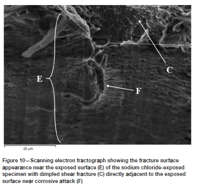 With regard to the sodium chloride-exposed material, it is possible that the degradation in the crack growth response is adversely influenced by the localized stress concentrations that accompany the isolated pitting and areas of intergranular corrosion. The notch effects that arise from the presence of these surface defects would amplify the triaxial stress ahead of the crack front, which would aid in the extension of the crack. Nevertheless, the fact that the pits and grain boundary cracks were isolated and were not observed at the precrack tip highlights the probable contribution of hydrogen embrittlement.