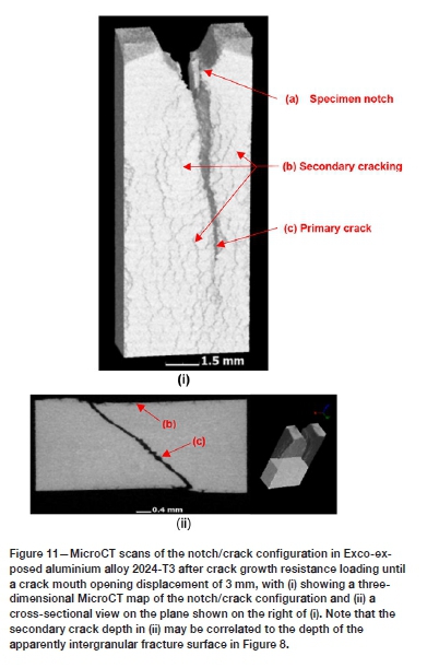 The fracture surface types (A) to (C) were found to repeat during all the exposure conditions investigated. However, only the EXCO-exposed specimens revealed the type (D) fracture surface appearance. The high-resolution scanning electron fractograph in Figure 8 shows the transition from intergranular (type D) to dimple fracture for the EXCO-exposed material in more detail, with Figure 9 showing higher magnification scanning electron fractographs of the fracture surfaces labelled C (Figure 9i) and D (Figure 9ii). It becomes apparent that significant weakening of the grain boundary strength has occurred during the two-hour exposure to the EXCO solution. It is also found that the intergranular fracture surfaces correlate well with the secondary crack formation (refer to the MicroCT scan in Figure 11) that resulted within the plastic zone of the material during crack growth resistance loading.