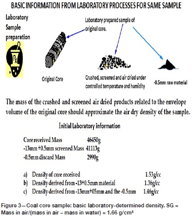 The assessment and tabulation of field, preliminary laboratory, and proximate analysis calculated values for the sample used in the example, which were obtained for density determinations, are illustrated in Table I. From the foregoing, very little difference is apparent between the methods utilizing the analytical data. Densities of 1.45 to 1.46 g/cm3 were obtained using an average correction factor of 0.83 for the solid matrix, which implies that the effective porosity of this sample is approximately 17%. In Table II the overestimation is determined by the final percentage by which the calculated value exceeds the mass of the measured air-dry material, i.e. the Archimedes-calculated mass of 50 865 g measured against 44 204 g results in an overestimation of approximately 15.06%. It is also apparent that the original field mass volume contains a fair percentage of moisture.