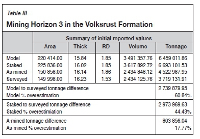 Two uniquely different types of deposit are represented by the mining horizons used in this reconciliation exercise. Mining horizon 3 in the Volksrust Formation represents a thick interbedded coal seam deposit, which includes coal and shale and requires beneficiation to separate the two main lithologies. The shales could be regarded as a contaminant but they need to be mined together, thus would constitute the raw reserve with respect to mineable run-of-mine tonnages. Mining horizon 6 in the Vryheid Formation, however, is classified as part of a multiple seam deposit; the coal portion can be extracted without beneficiation and can thus be considered as an in-situ Reserve.