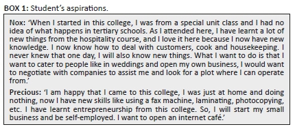 Being enrolled in TVET gave the students epistemological access. Here, students were given the opportunity of gaining new knowledge through accessing learning resources and lecturers knowing their profiles that helped with being scaffolded and remediated where necessary. The students also benefited from the integrated teaching that lecturers employed. Integrated teaching between the vocational lecturers and the special educators enabled the students to be given attention and units objectives tailored to their profiles. In this way, students were able to access content that eventually gave them some capabilities achievement. New knowledge acquired shaped students' aspirations for their future. Box 1 demonstrates an example of these aspirations as expressed by student participants.