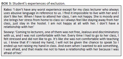 At times some students felt epistemologically excluded when certain lecturers failed to help them engage with content. For example, some students were afraid to tell their lecturers when they had a problem with content because certain lecturers were impatient with students. Some lecturers used abusive language, which resulted in students not wanting to come to class or feeling intimidated. In such instances, affected students revealed that they resorted to not asking questions and not participating in class. Box 3 captures student expressions of these experiences.