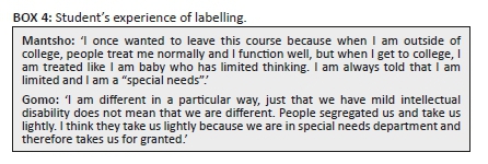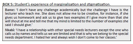Whilst labelling in inclusive education is not something new (Boyle 2014; Boyle & Sharma 2015), we argue that the policy landscape and school system socially constructed the labels, which the collegiate community adopted and used to refer to these students. In other words, the use of the word 'special needs' became an institutional practice, which was exclusionary in nature. Becker's (1963) labelling theory suggests that labels serve as special markers, which are used to identify and classify particular students in institutions or society. Although labelling to other scholars (Booth & Ainscow 1998) is to recognise differences and confer social salience to those differences (Arishi et al. 2017), in the context of this study, some students experienced labelling as a discriminatory practice despite it being used by the department for the purpose of special educational provision. Studies have shown that marginalisation goes hand in hand with stigmatisation. A study by McDaid (2008) showed that professionals are also amongst the populations that stigmatise within their profession. This was the case with this study, where students were stigmatised by their lecturer who dehumanised them verbally, physically and emotionally. Evidence of this is provided in student statements in Box 5.