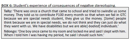 Some students were labelled and deemed incompetent. One of their lecturers communicated low expectations of them instead of having a positive attitude, which could have countered collegiate community negativity. The stereotyping that some students experienced resulted in them being categorised and pigeonholed. This labelling increased the distance between provisions that students were afforded. For instance, some students without disabilities treated students with disabilities as not equal to them. The behaviour yielded sexual abuses with the belief that students with disabilities would not be able to reason and identify their perpetrators. Not only was a student with disabilities sexually abused, but some students with disabilities were also taken advantage of in terms of their possessions. Furthermore, outside people masquerading as churches and insurance people wanted to rob them of their allowances. Box 6 shows some of the excerpts that demonstrate these experiences.