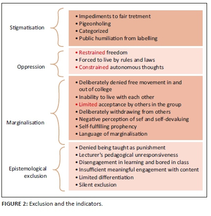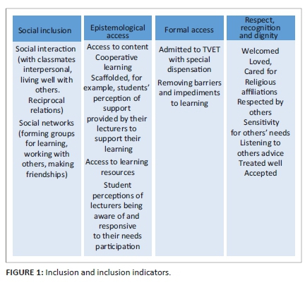 The experiences of students in relation to inclusion are summarised in Figure 1, which shows indicators of how inclusionary practices were identified from the data. Four key areas were identified, namely (1) social inclusion; (2) epistemological access; (3) formal access and (4) respect, recognition and dignity.