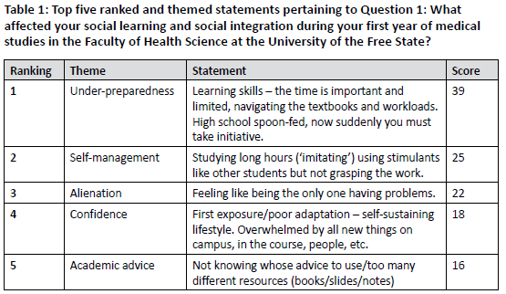 Table 1 summarises the top five ranked statements indicating factors that affected students' social learning and integration. Five themes were identified during the analysis of the data in response to Question 1.