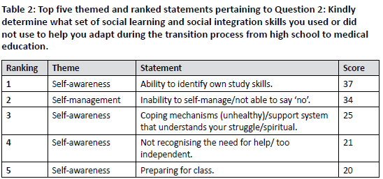 Table 2 represents the top five ranked statements indicating social learning and integration skills that the students used or did not use to adapt as they transitioned from high school to university education. Two common themes (self-awareness and self-management) emerged from the analysis of the data in response to Question 2 of the study.