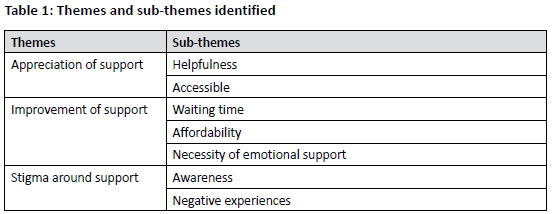 The findings fell within the following three broad themes: (1) Appreciation of support; (2) Improvement of support and (3) Stigma around support. For theme 1, Appreciation of support, students found support services helpful and beneficial and therefore appreciated how staff were friendly and helpful. For theme 2, Improvement of support, students indicated that even though support services were available to them, they only accessed them in the later years of their studies and recommended ways to better communicate support services to them. They also emphasised that issues with specific support services, like the lengthy waiting times for the CSCD, should be improved. For theme 3, Stigma around support, students described the fears they experienced around needing to make use of support services as a result of experiencing immense stress within the clinical platform during their training.