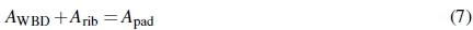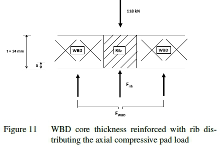 The pad area (Apad) is 8.5 χ 10-3m2. Referring to figure 12, the pad area is segmented into two areas; namely the area wherein the WBD material supports the load (AWBD) and the area wherein the rib supports the remaining load (Arib). The relationship between the two areas is expressed with equation 7.