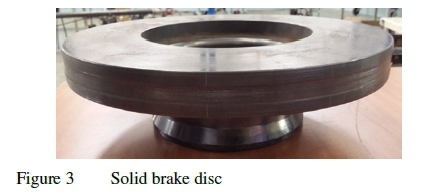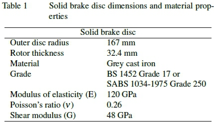 Testing was conducted on a commercially available solid brake disc (see figure 3). The grey cast iron disc was cast as a single unit and heat treated, and sized to fit the hub of a Mercedes-Benz Atego 500 (medium-duty truck). A uniform thickness was obtained around the solid brake disc by skimming the disc prior to testing. The solid brake disc dimensions and material properties are shown in table 1.