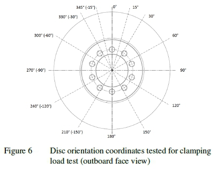 Referring to figure 6, the torque load test was completed at all the disc coordinates for the clamping load test, with the additional positions of 45°, 75°, 285° (or -75°), and 315° (or -45°). To prevent damage to the data acquisition equipment, a pneumatic chamber pressure of 4 bar (equivalent to 50.4 kN of pad clamping force) was applied to the brake disc to ensure it would not rotate under the maximum applied torque (approximately 1030 Nm). The torque was applied in a counterclockwise direction as viewed from the outboard standpoint,