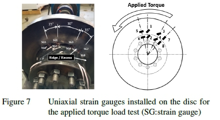 The second test performed was the applied brake torque load test to characterise the disc shear stresses due to the applied brake torque. The shaft torque (hence disc braking torque) was determined using two pairs of biaxial 0°/90°stacked strain rosettes installed on the shaft.