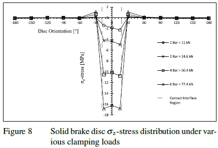 The stresses experienced by the solid brake disc due to the compressive clamping load applied by the brake pads are limited to the disc/pad contact interface only and do not distribute to the other regions of the disc, as zero stresses where measured in the regions away from the disc/pad contact interface between -60° to -180° and 60° to 180°.